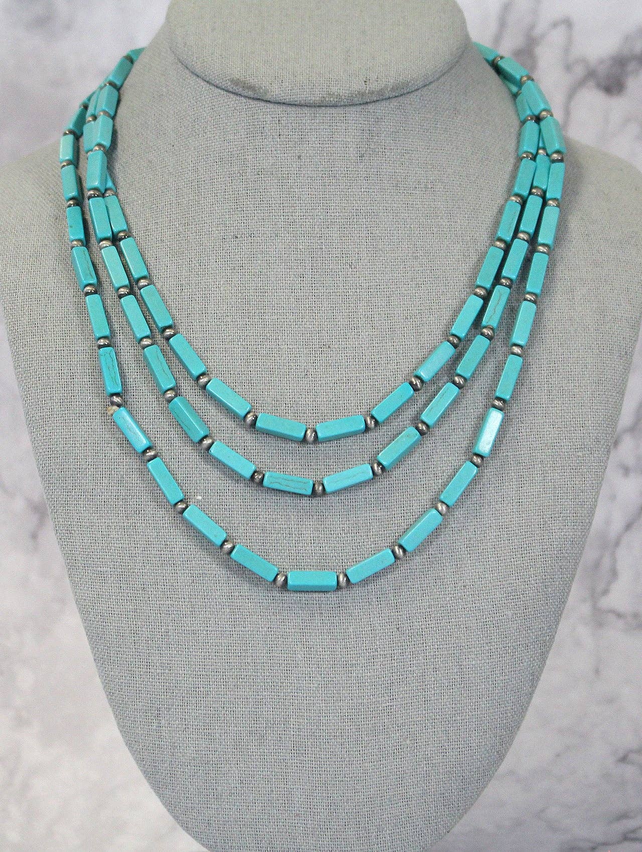 Check out this Western Rectangle Turquoise bead necklace. This necklace has 3 different layers with faux silver burnished beads throughout each layer.