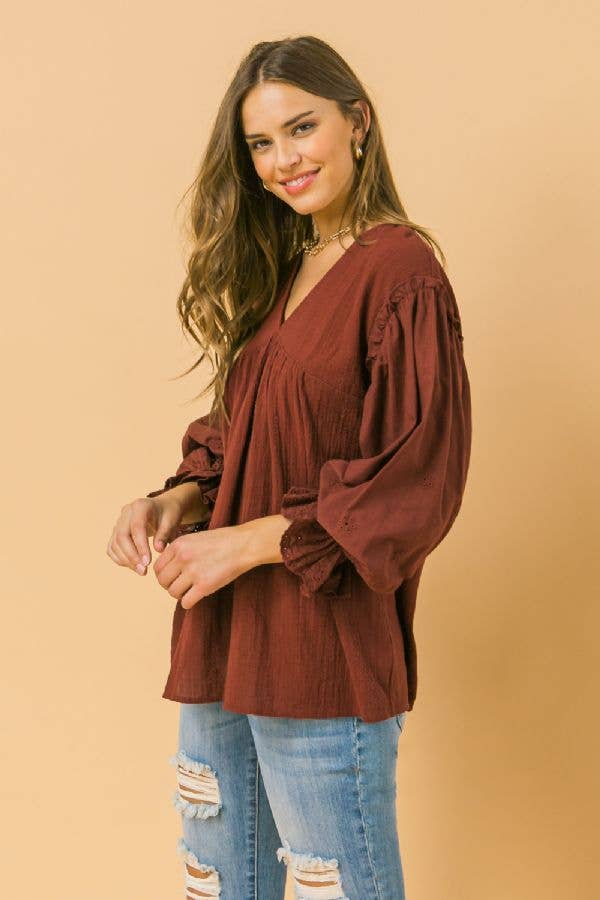 A textured/eyelet combination woven top featuring V neckline, drop shoulder, ruffle at seam, eyelet peasant sleeve and relaxed body