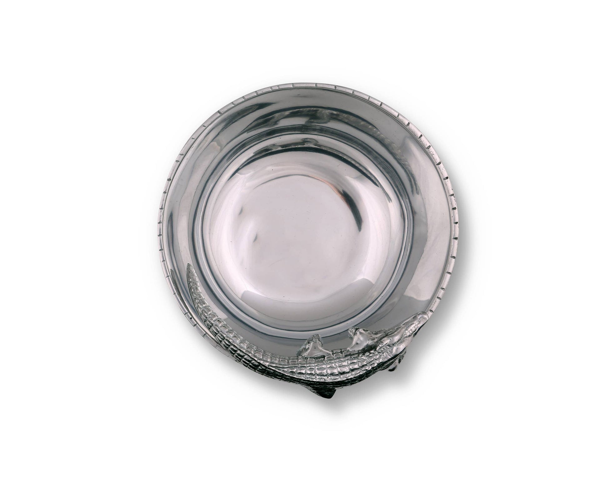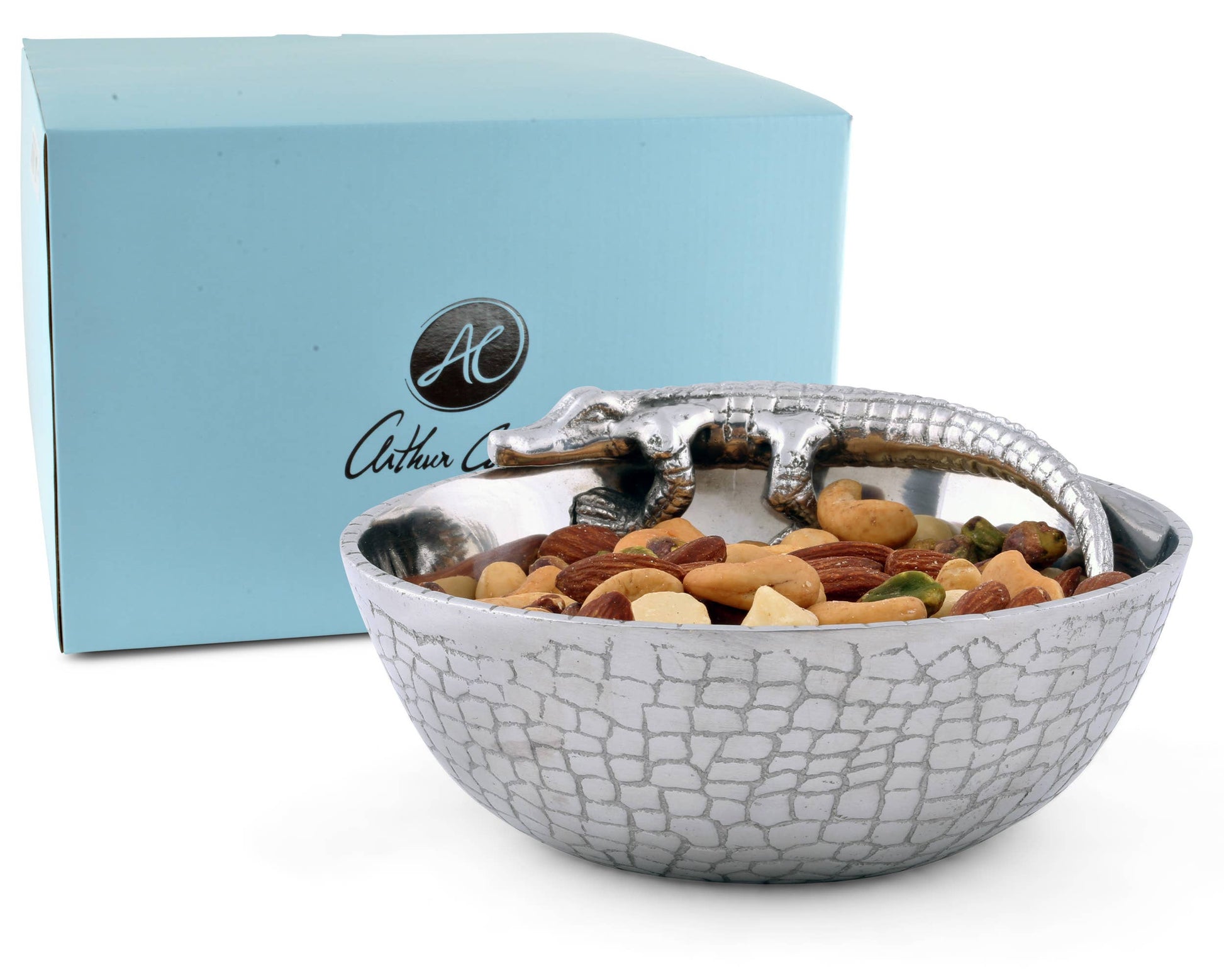 Induce a jaw-dropping reaction from your guests with this unique 6" Alligator Bowl from Arthur Court. A stealthy alligator crawls along the edge of this piece, its legs clasping onto the side as its long, detailed tail swishes behind it. Handcrafted in lustrous aluminum, this bowl combines a shiny interior with a rough, scaly exterior for a beautiful mixture of textures. Size: Diameter: 6.0" / H: 2.5" Care: Wash by hand with mild dish soap and dry immediately - do not put in dishwasher.
