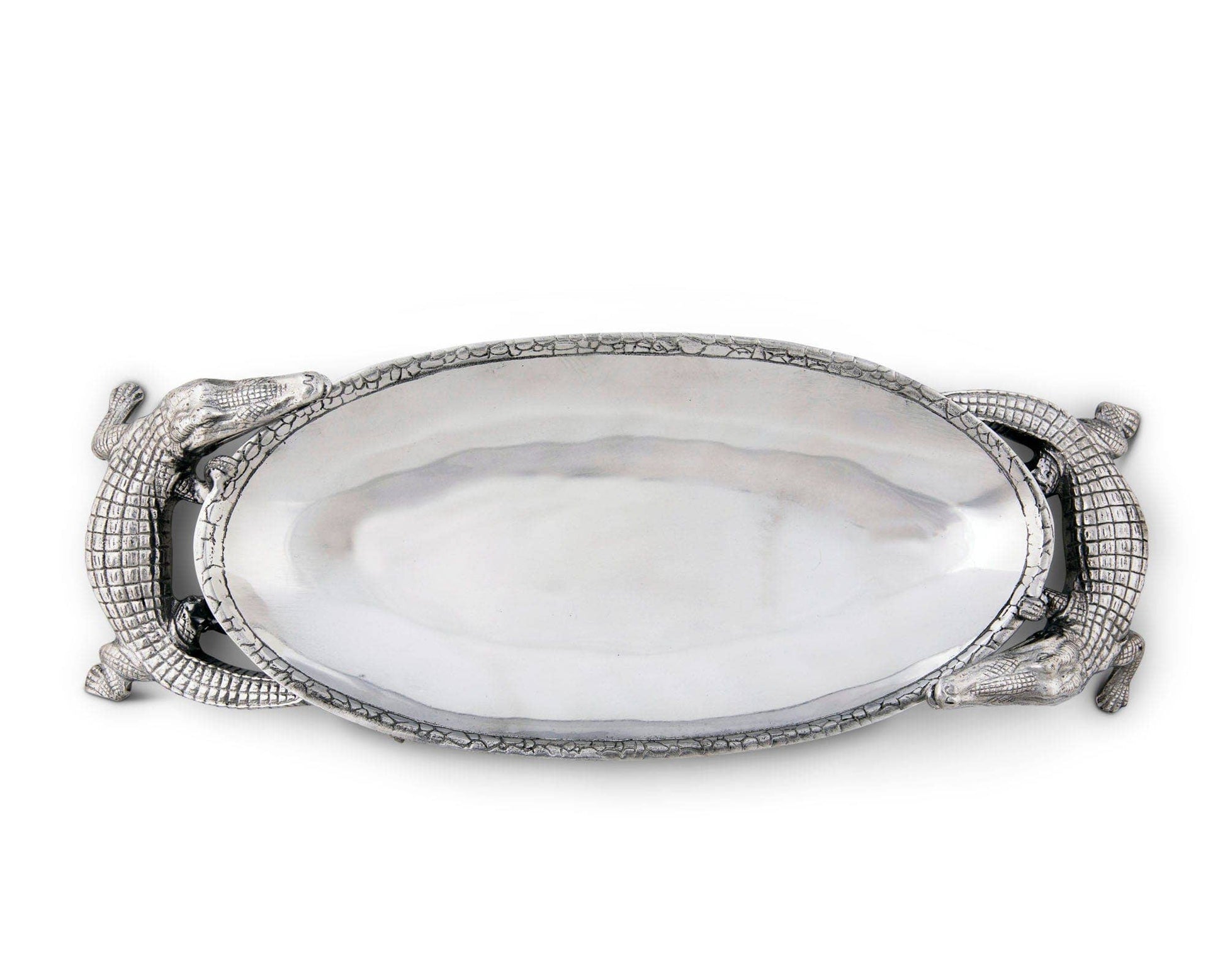 Realistically patterned alligators circle this piece as they peer into the center, seemingly craving what's inside. Produce the same reaction from your guests when they see what you've displayed in the lustrous interior of this handmade, aluminum tray.