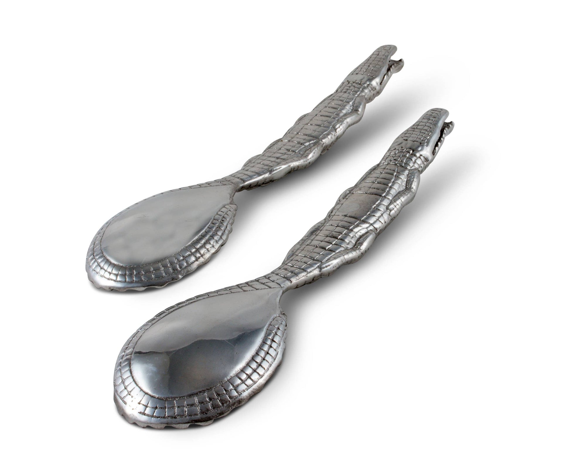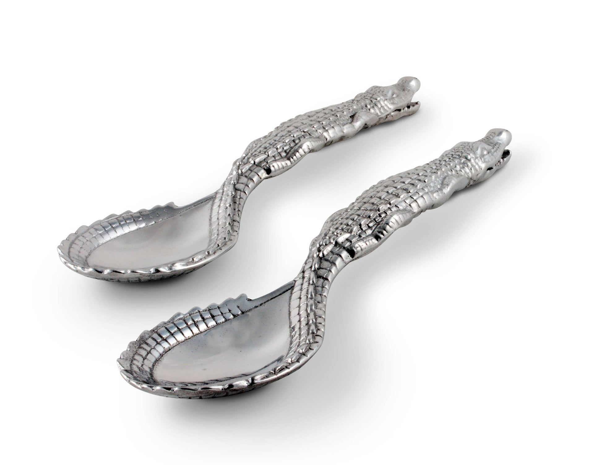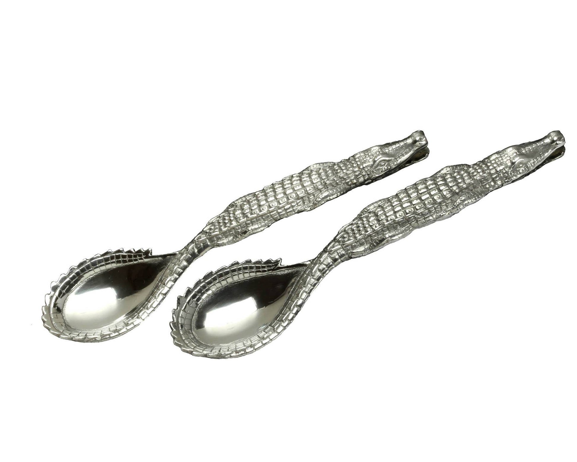 Give some bite to your salads with this Alligator Figural Serving Set from Arthur Court. Alligator heads and legless bodies form the handles of these pieces, while their tails create a unique border around the edge of the bowl. Handcrafted in sand-cast aluminum, this set is as versatile as it is detailed. Size: L: 12.5" Care: Wash by hand with mild dish soap and dry immediately - do not put in dishwasher.
