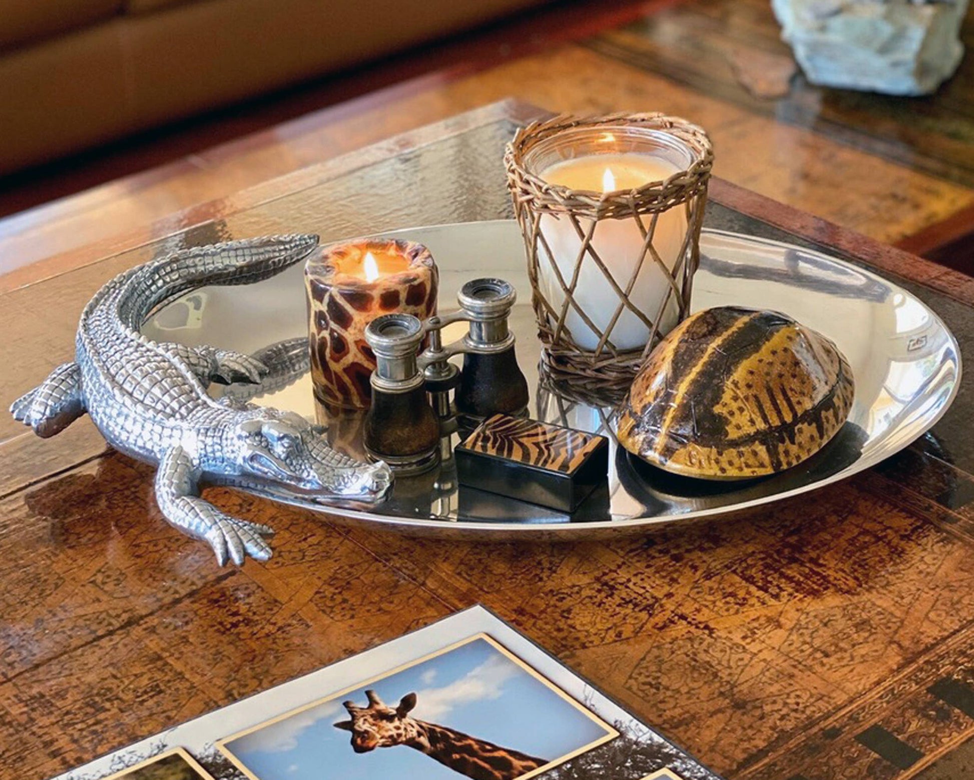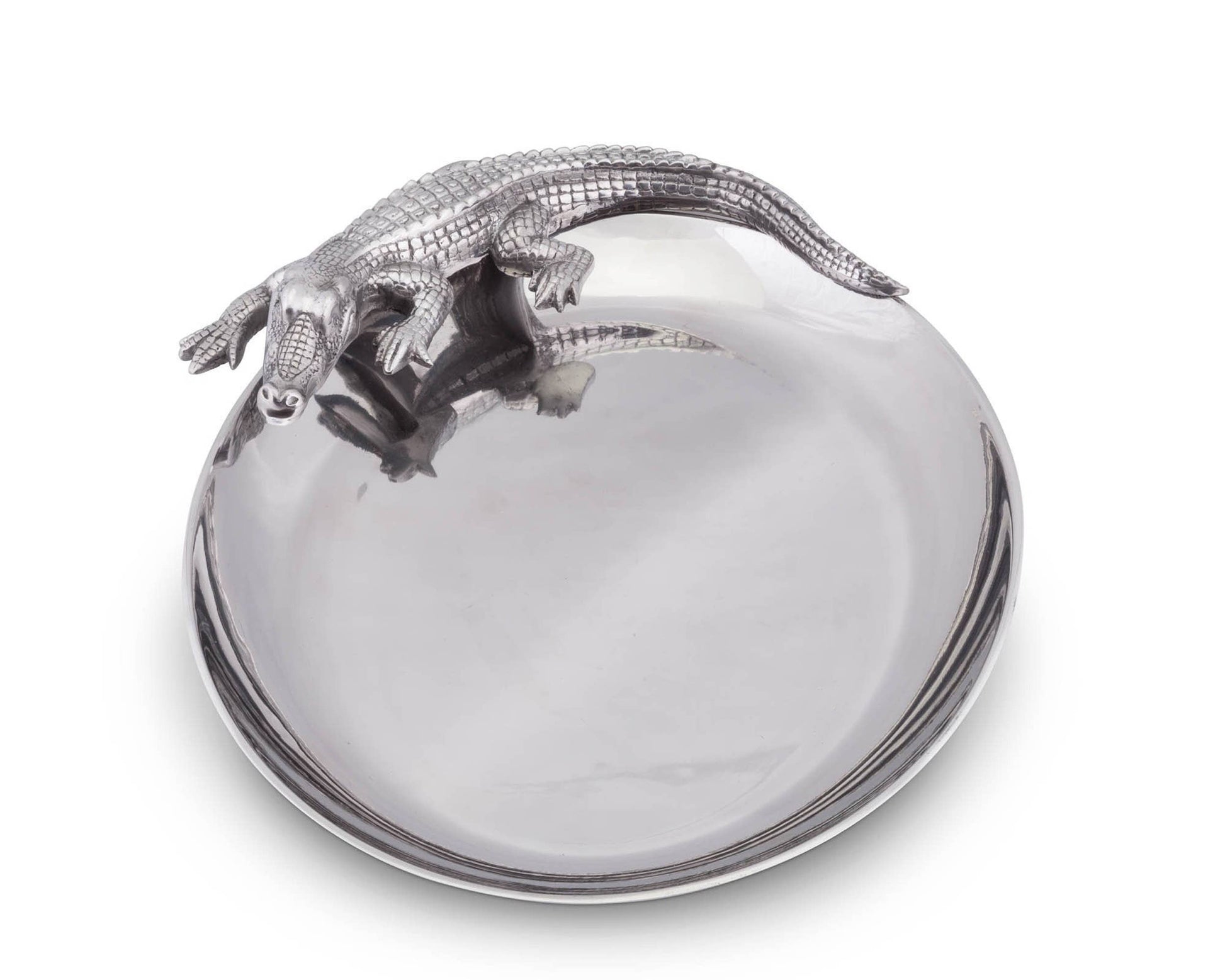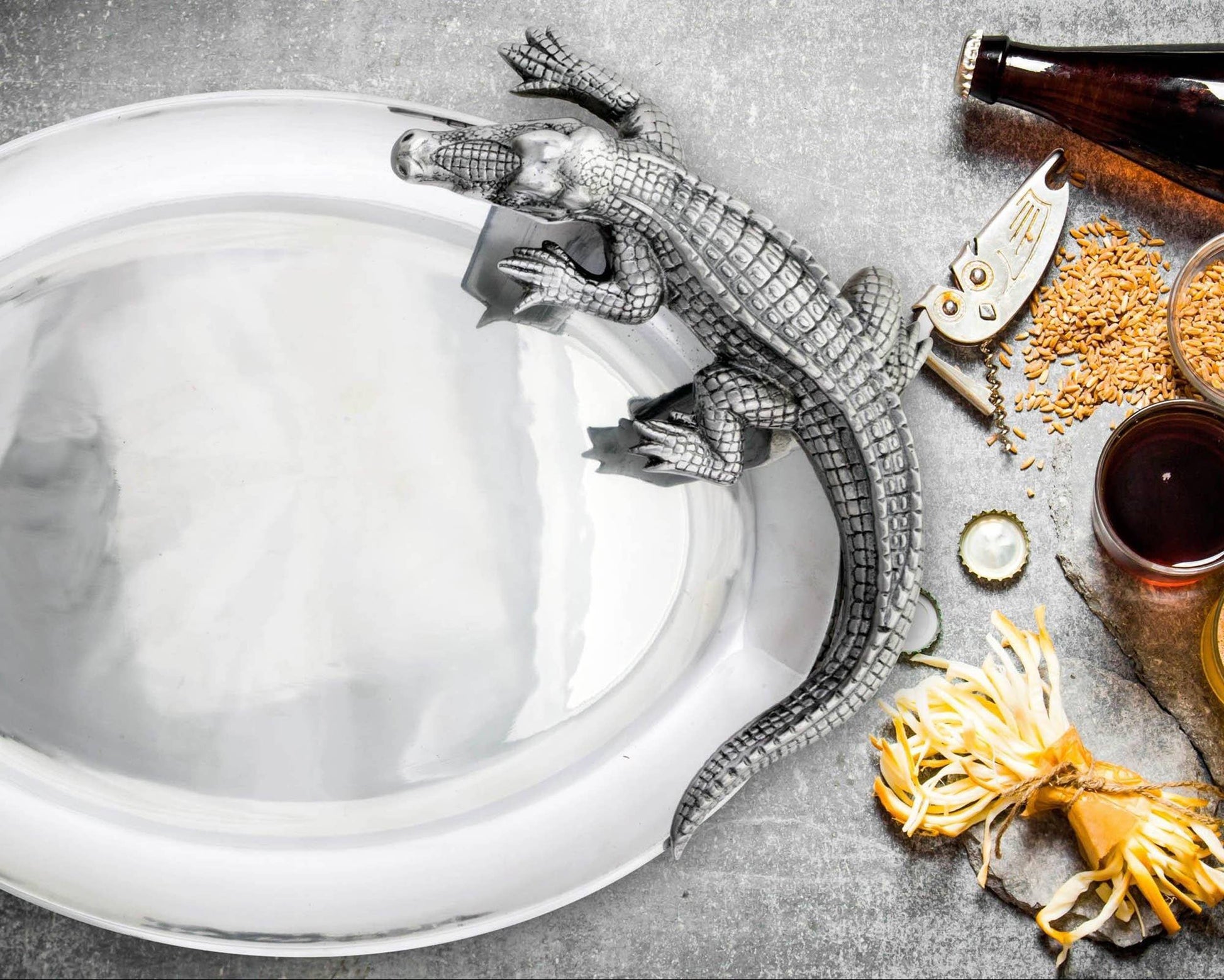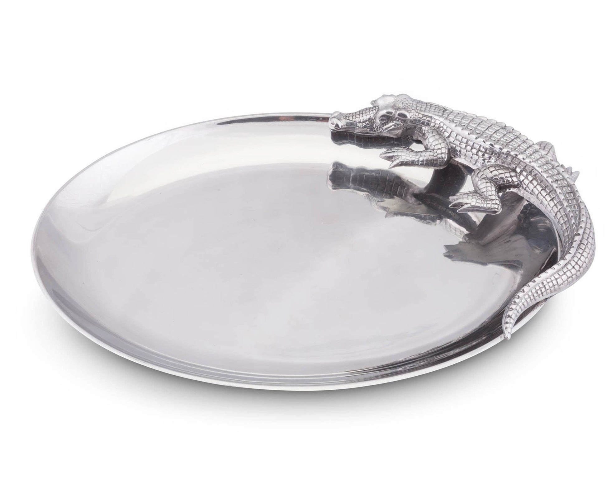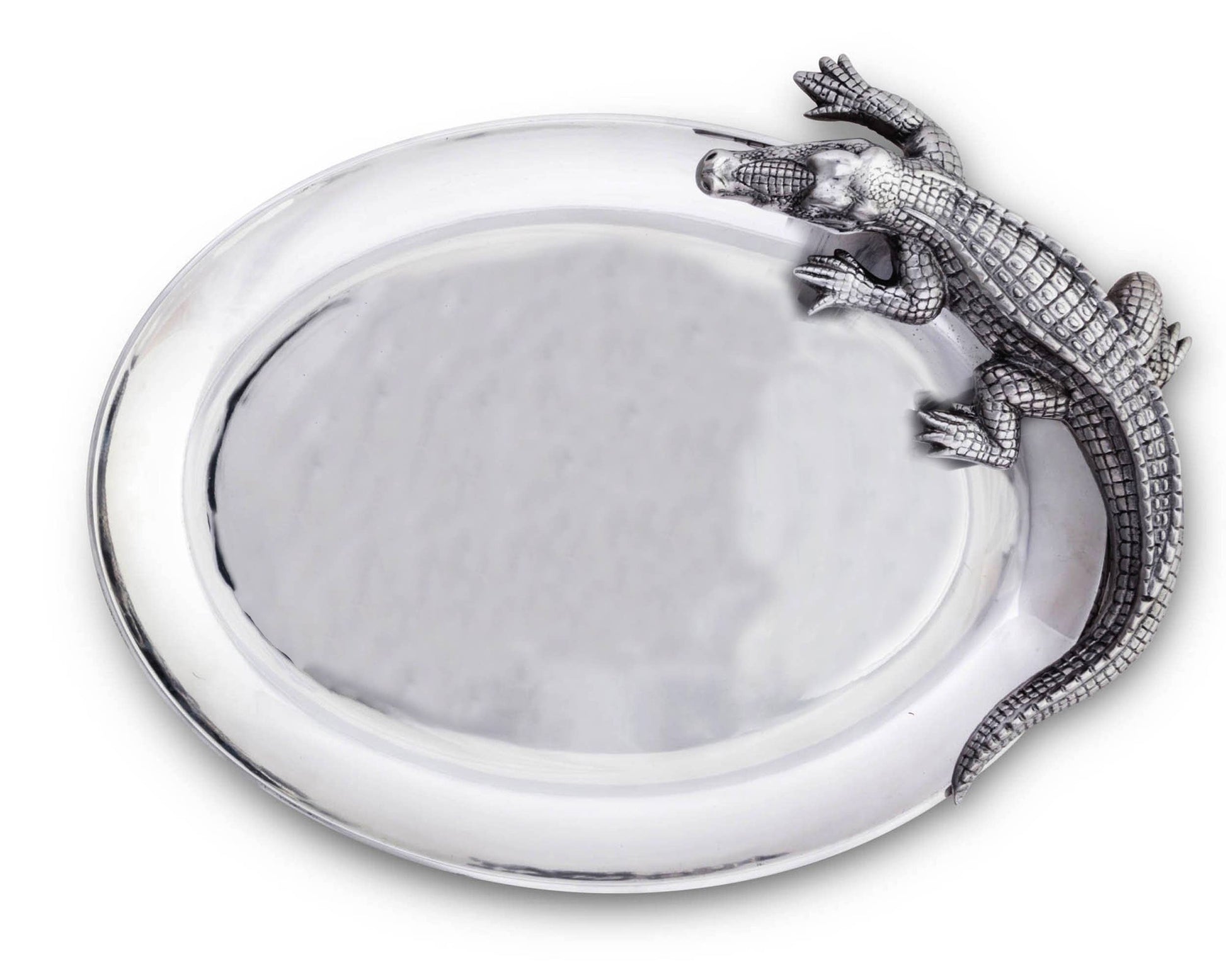 Debut your signature dish on this lively Alligator Oval Platter from Arthur Court. Crafted with striking realism, this large alligator shows off its scaly patterned hide and long, whippping tail as it slinks around the edge of this piece. The statuette's rough texture contrasts beautifully with the unblemished interior of this handmade, aluminum dish. Size: Wide: 14" Long: 19.5" Care: Wash by hand with mild dish soap and dry immediately - do not put in dishwasher.