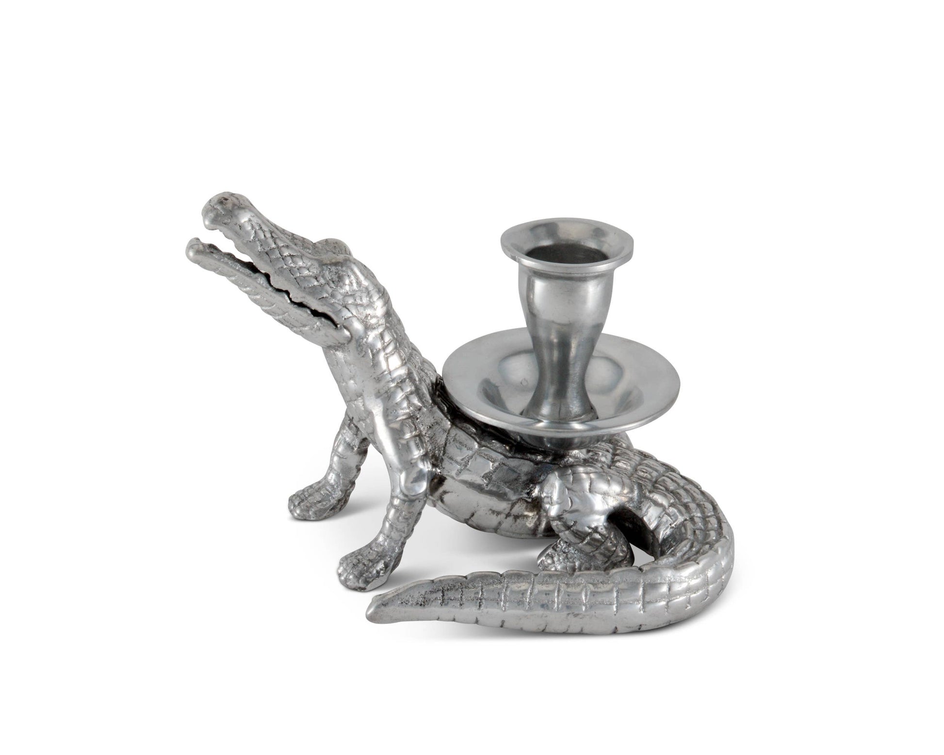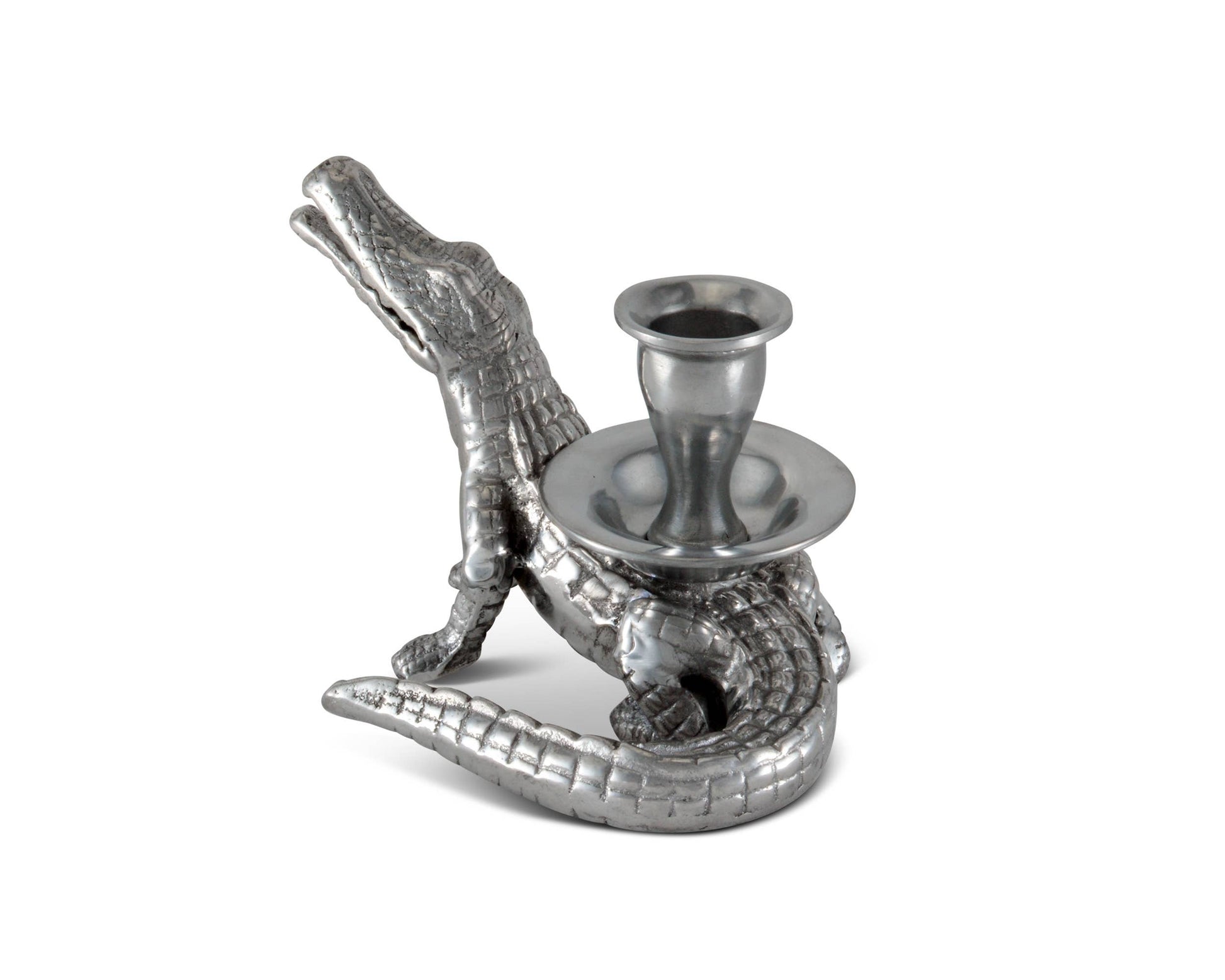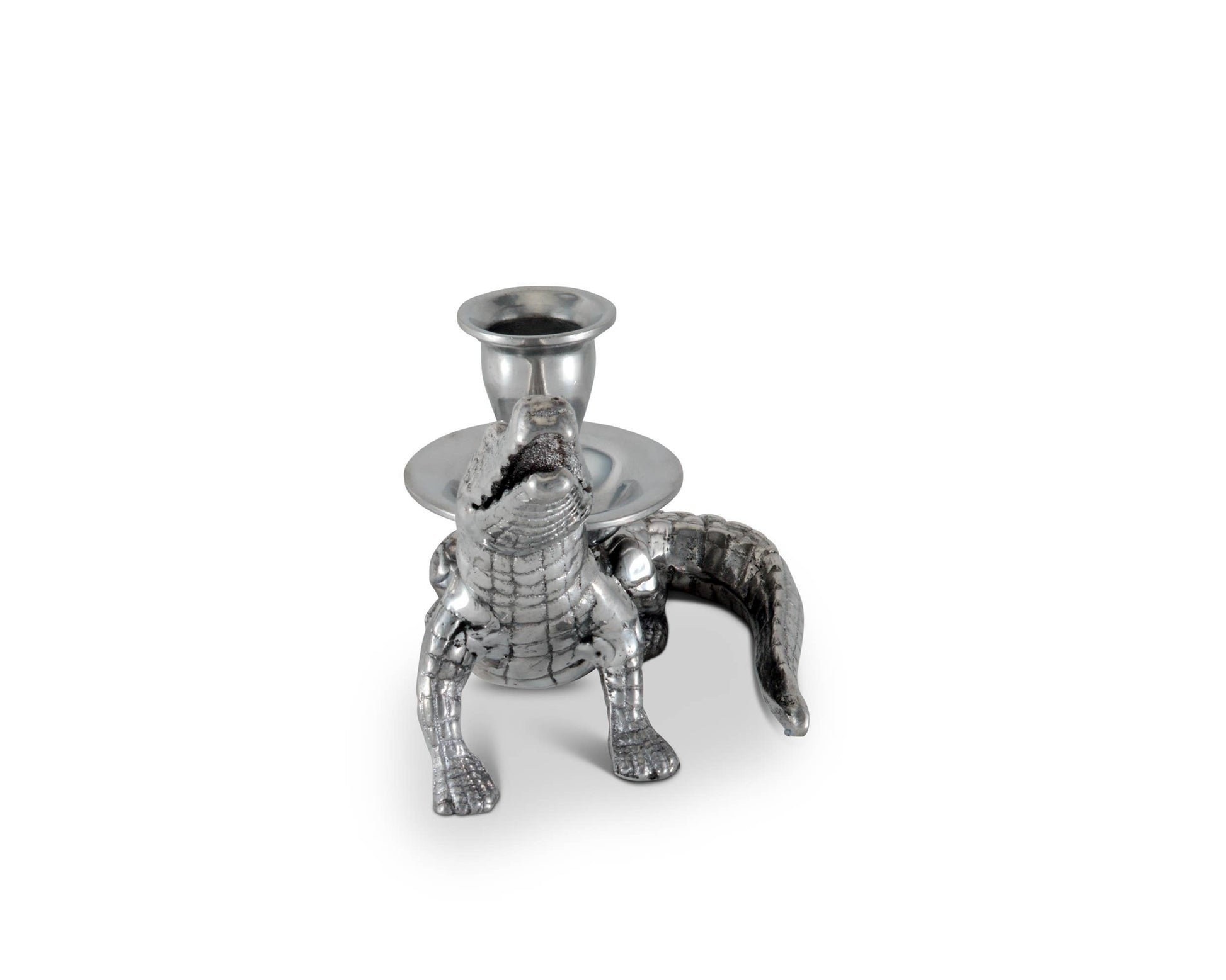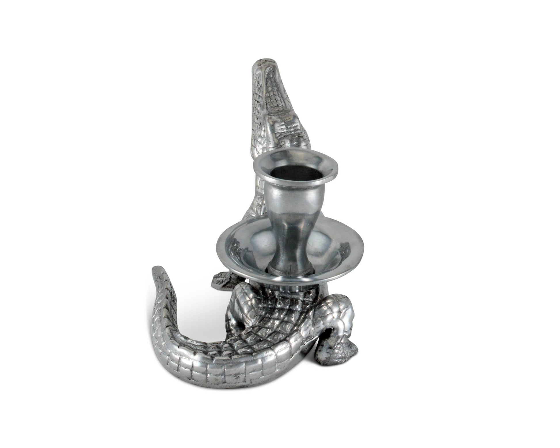 More friendly than fear inspiring, the Arthur Court Alligator candle holder features extraordinary detail in our exclusive aluminum alloy. The alligator statuette has an open mouth with perfectly detailed features from his mighty teeth, patterned hide all the way down to the claws on his feet. A rimmed candle cup will hold your taper candle on his back. An amazing alligator on his own, buy a pair for the complete alligator theme you are creating. Size: 4" H x 4" W x 6" L Care: Dust with damp cloth. Will not tarnish.