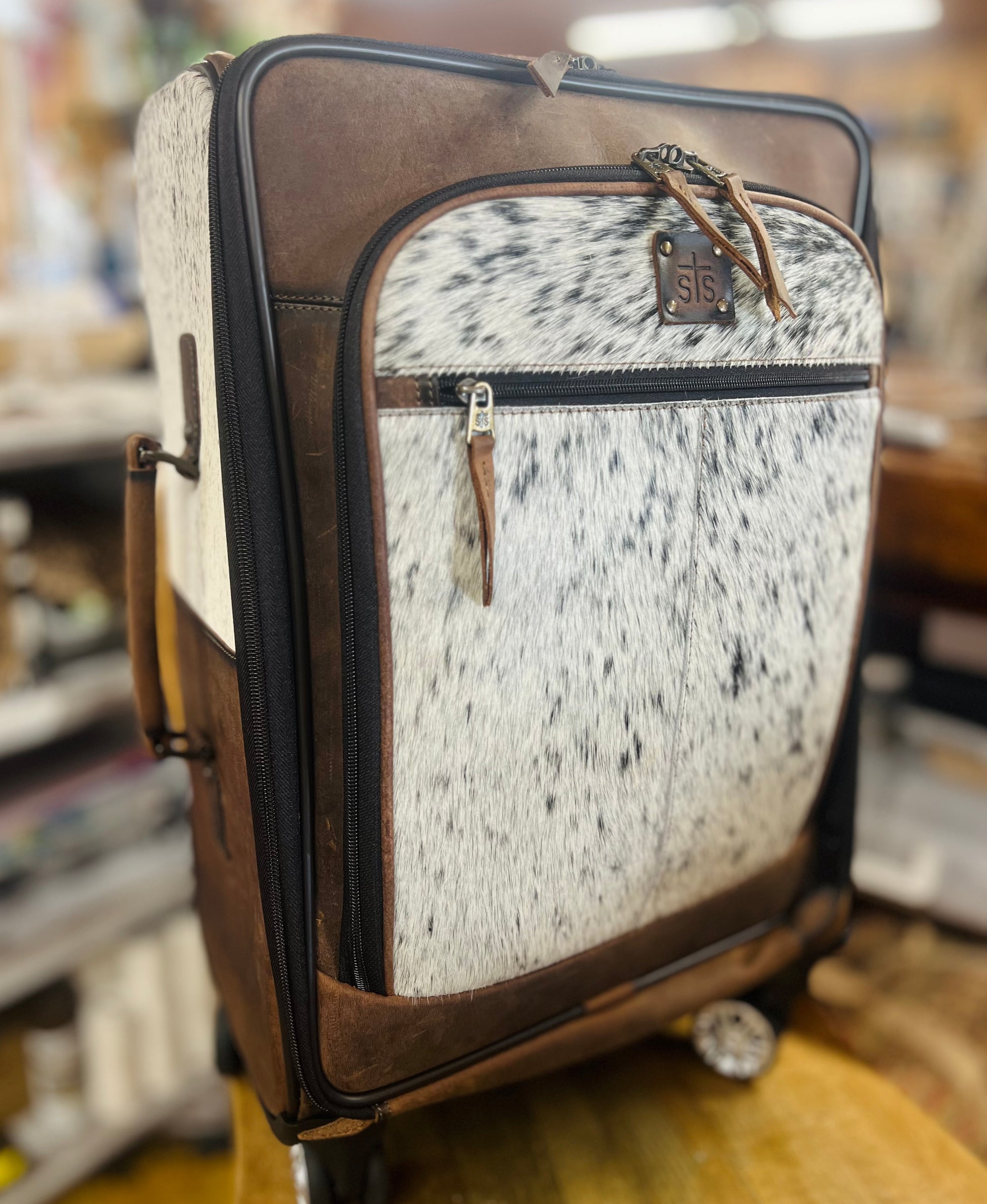 Travel in style with the Cowhide Rolling Suitcase that is made from hand selected hair on hide with genuine full grain leather.