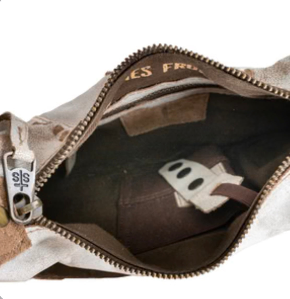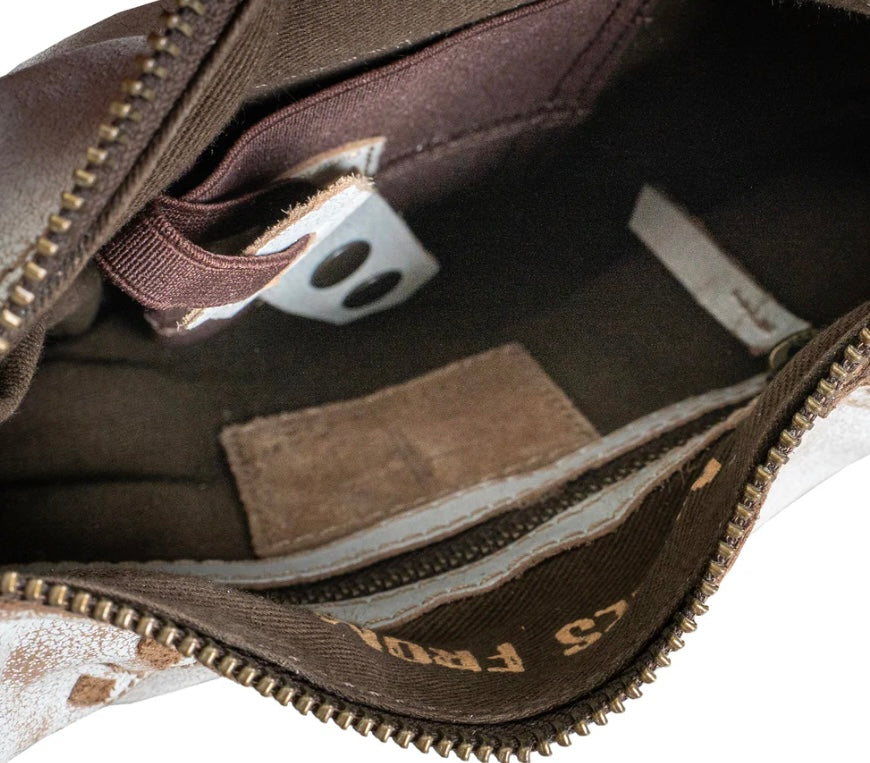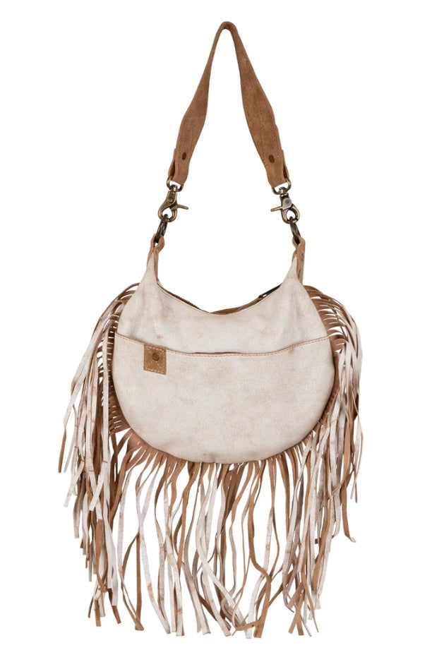The Cremello Nellie Fringe Bag features full grain leather which is crackled to reveal an under crust of soft tanned suede. That same soft tan suede is seen in buck stitch and threaded accents. Finished with distressed hardware for the perfect addition to your wardrobe.