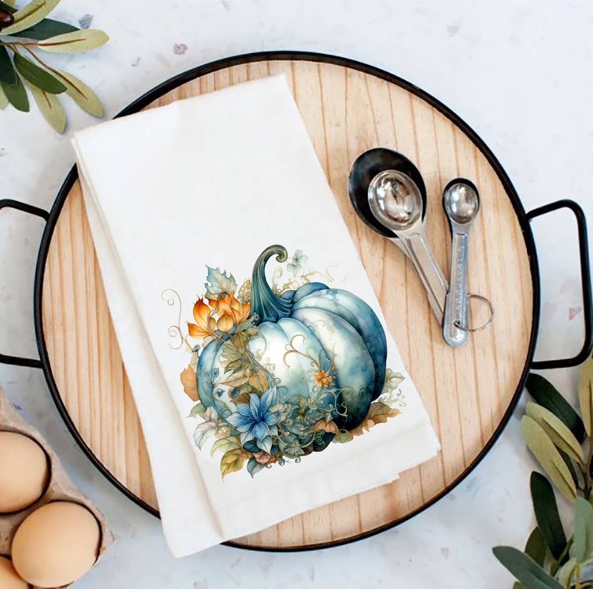 Fall Autumn Blue Pumpkin Flowers Flour Sack Tea Towel
