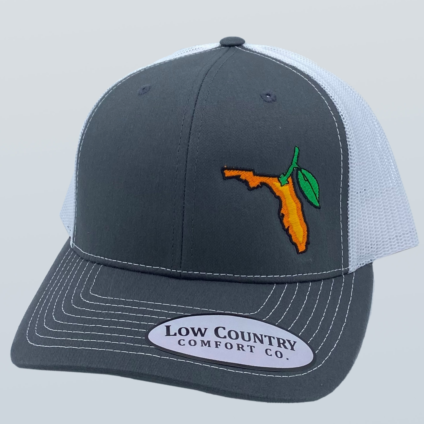 Add a touch of vibrant charm to your everyday look with our Florida Orange 2 Charcoal/White Hat. This trucker snapback hat, decorated in the USA, is a versatile accessory that blends style and comfort. As part of the Riverbed Threads collection, this men's hat embodies the brand's dedication to quality and craftsmanship. Riverbed Threads, a veteran-owned and operated business, is known for its unique hat and t-shirt apparel.