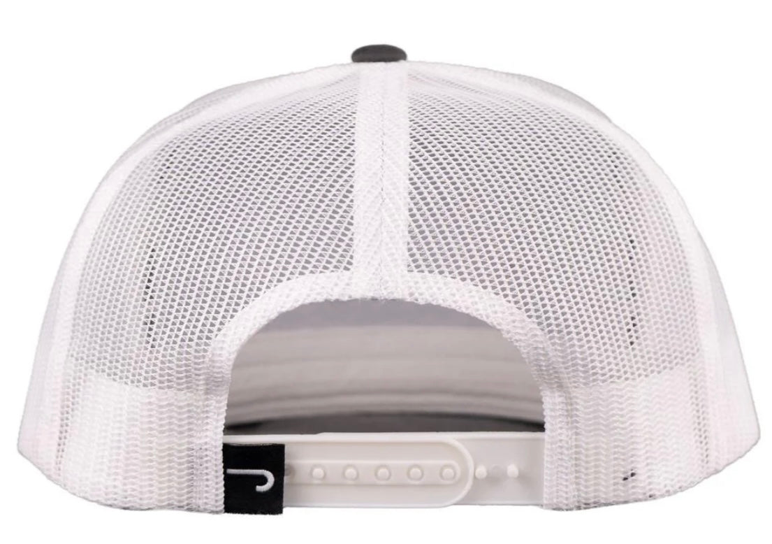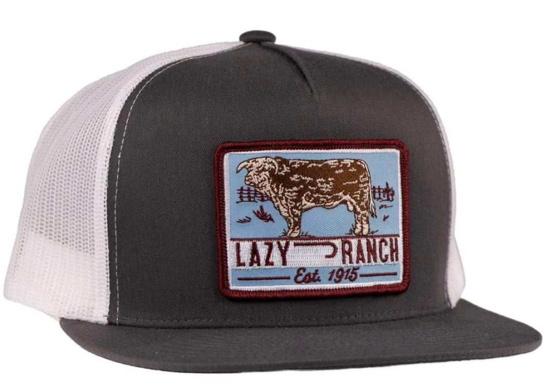 LAZY J RANCH GREY WHITE BULL TRAP PATCH CLASSIC FIVE PANEL TRUCKER HAT