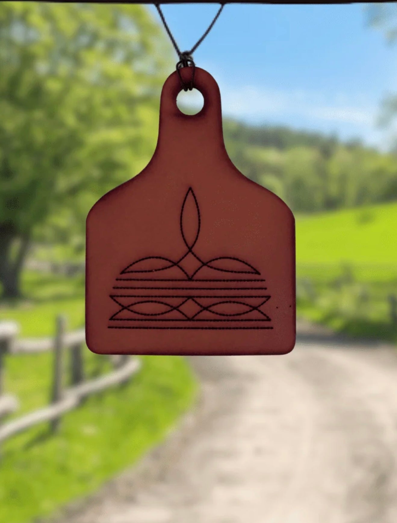 Revitalize your car interior with our Ear Tag w/Boot Stitch Leather Car Freshener. Made from high-quality genuine leather sourced from Texas, this car accessory not only adds a touch of luxury to your vehicle but also keeps it smelling fresh and clean.