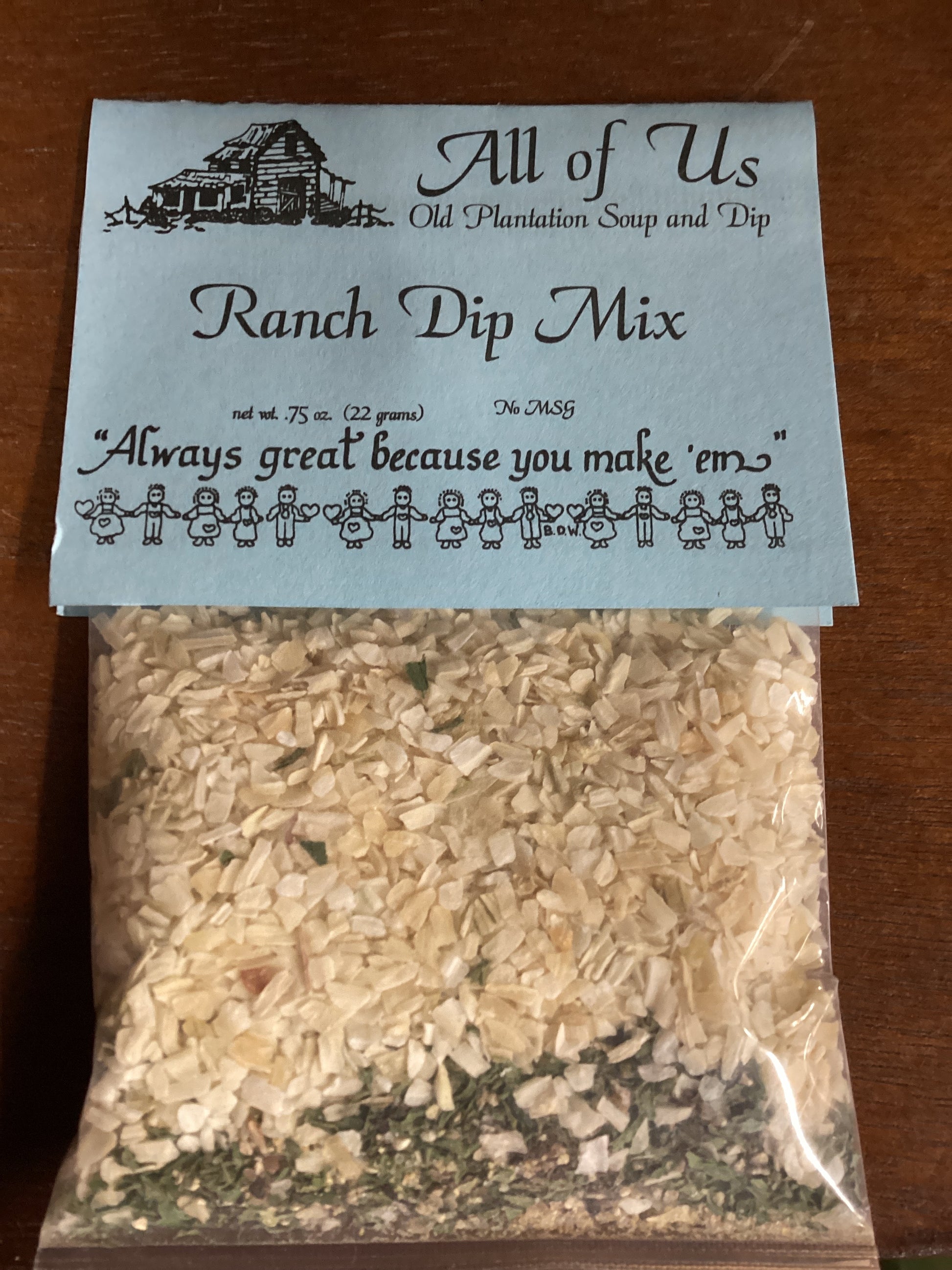 All of us soup and Dip Ranch Dip Mix. See picture for ingredients and instructions