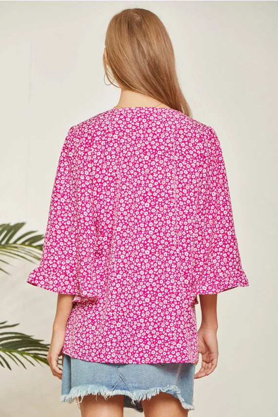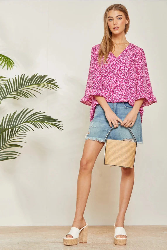 This top features a v-neckline and 3/4 sleeves. Non sheer.