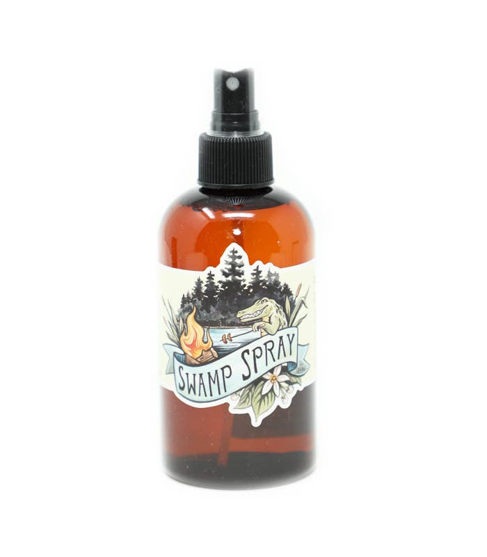 A room & linen spray made by swamp creatures, for swamp creatures. Instantly transport yourself with top notes of citrus + fresh water & bottom notes of woods, earth & fire. Crack a cold one, roast a dog & enjoy the Floridian sensory escape, wherever you may be. Artwork by Veronica Steiner.